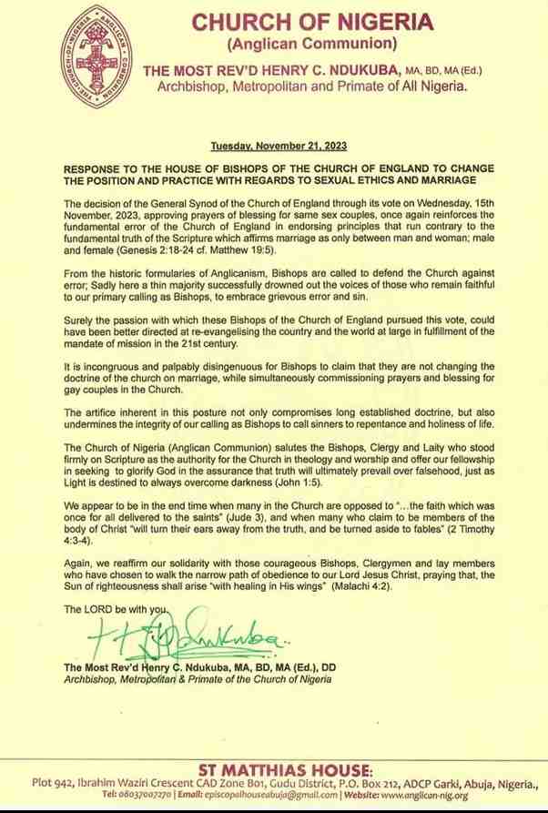 His statement captioned, “Response to the House of Bishops of the Church of England to change the position and practice with regards to sexual ethics and marriage” dated November 21, 2023 is reproduced below: