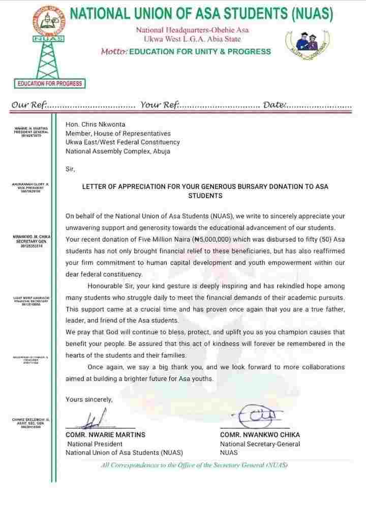 The National Union of Asa Students, (NUAS), has extended gratitude to the member representing Ukwa East/Ukwa West Federal Constituency in the House of Representatives, Chief Chris Nkwonta, for the donation of N5 million bursary award to its students.